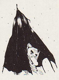 雨の日の帰り道、マユミは、雨でぐちゃぐちゃの道を帰ってきた。ふと気がつくと、後ろからふしぎなおばあさんがやってくる。なんと、おばあさんとマユミは土手の横を歩いていた。左には、畑が壁のように立ち上がり、右には黒い雲があったのだ・・・手慣れた語り口で、佐藤さんは、土手を左90度傾けてしまう。自分の体が傾いたかのように錯覚するほど、あざやかに雨の土手を歩く気分にさせてくれる。なんとも見事な描写である。おばあさんの正体も、マユミと歩いた理由も、面白く、楽しいものだ。思わず「くすっ」と微笑みたくなる。 そうそう、一昔前なら、ちょっと郊外に出かければ、マユミが歩いたような土手道はそんじょそこらにあったのだ。そう思いながら、もう一度読み返すと、なつかしいある描写にたどり着いた。「白くて大きな五十円玉」。そうだ、50円玉は白くて大きかったのだ。